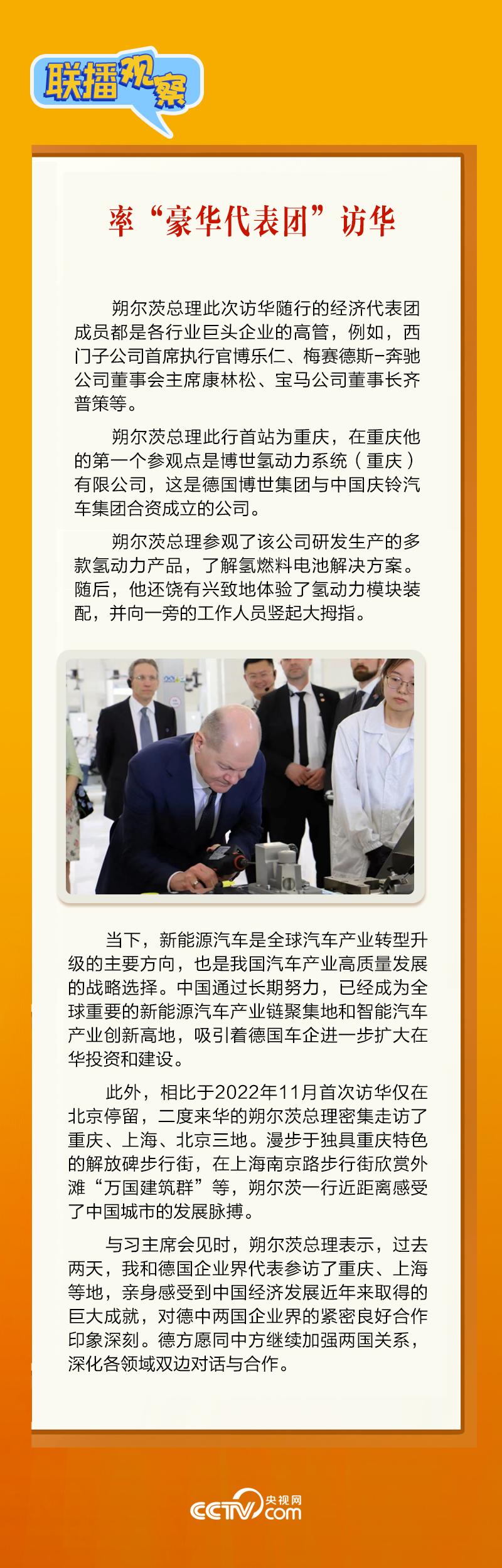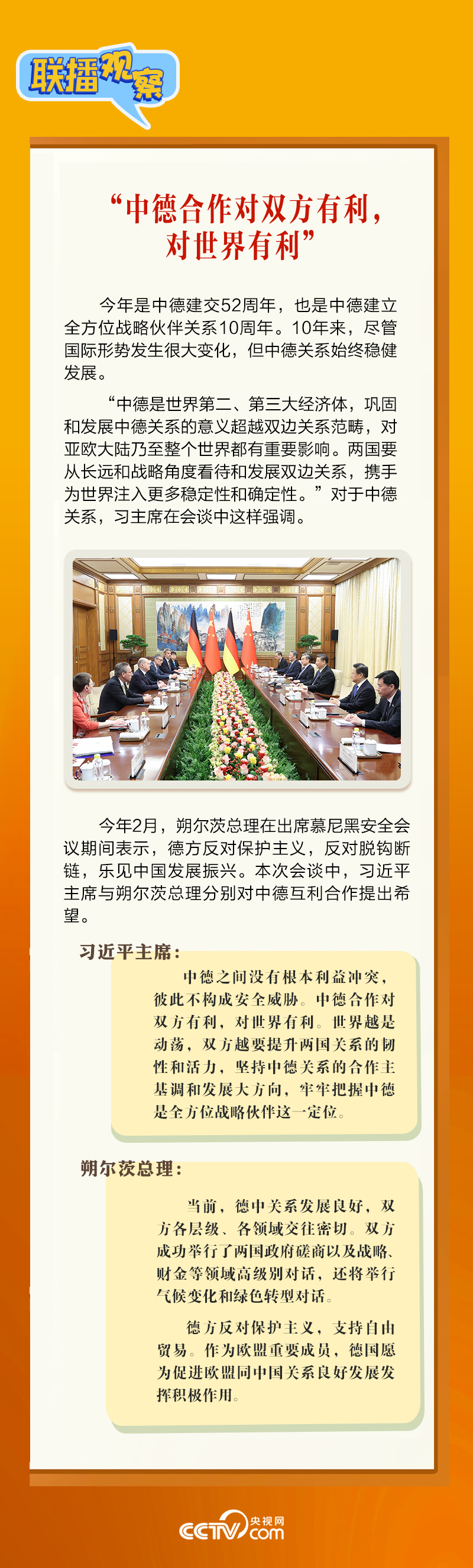 4月16日上午,習(xí)近平主席在北京釣魚臺國賓館會見朔爾茨總理。會見中,習(xí)主席強(qiáng)調(diào),要“牢牢把握中德是全方位戰(zhàn)略伙伴這一定位”。中德建立全方位戰(zhàn)略伙伴關(guān)系10年來,兩國如何共同發(fā)展,相互成就?央視網(wǎng)《聯(lián)播觀察》帶您了解。