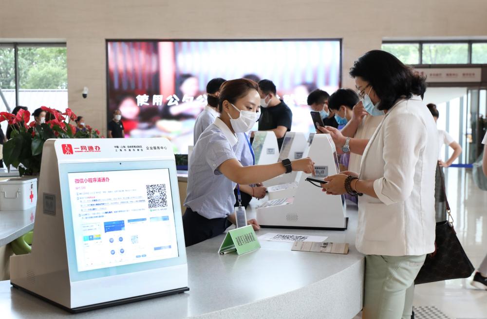 上海市浦東新區(qū)2019年率先啟動“一業(yè)一證”改革。這是在浦東新區(qū)企業(yè)服務中心辦事大廳,工作人員指導市民通過手機小程序辦理一網通辦業(yè)務(2020年8月4日攝)。