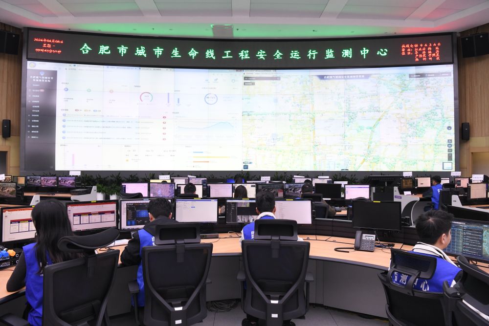 技術人員在位于清華大學合肥公共安全研究院的合肥市城市生命線工程安全運行監(jiān)測中心值守(2024年4月8日攝)。合肥市2015年啟動城市生命線安全工程建設,逐步構建燃氣、橋梁、供水、排水、熱力、綜合管廊、消防、水環(huán)境八大領域立體化監(jiān)測網,探索出一條以場景應用為依托、以智慧防控為導向、以創(chuàng)新驅動為內核、以市場運作為抓手的城市安全發(fā)展新模式。