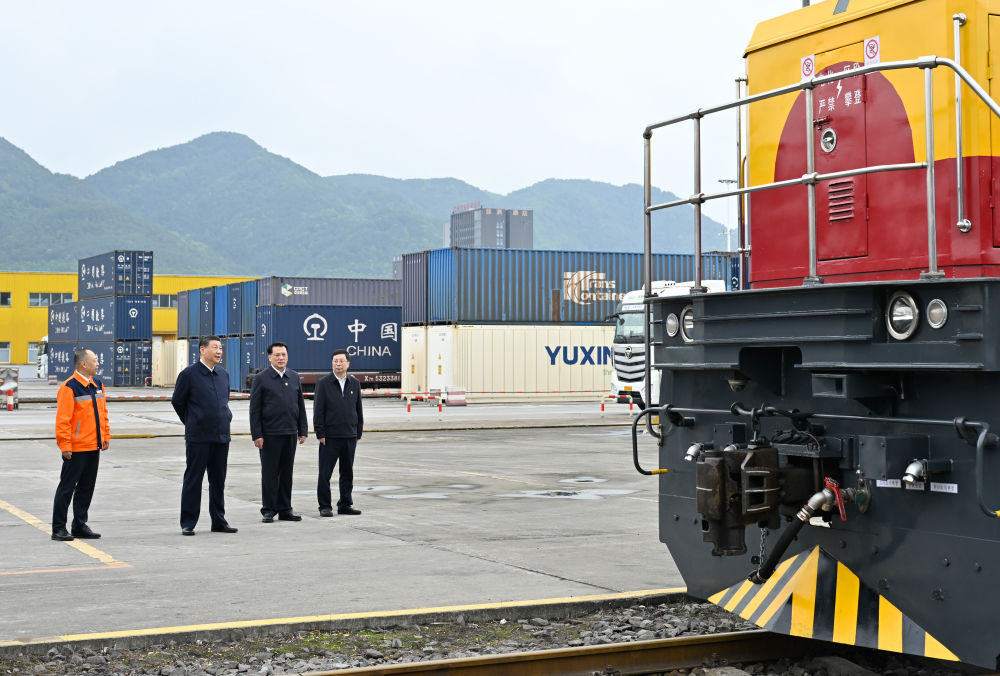 這是4月22日,習近平在重慶國際物流樞紐園區(qū),了解當地加快建設西部陸海新通道等情況。