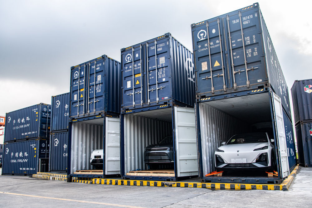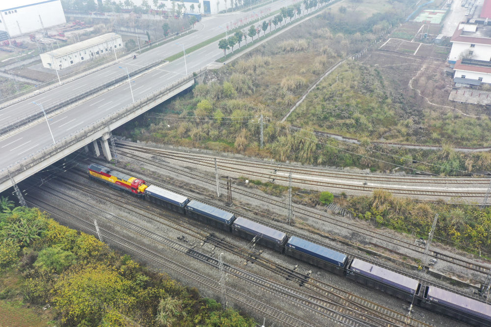 2023年1月22日,一趟西部陸海新通道鐵海聯運班列從重慶團結村中心站發(fā)車(無人機照片)。班列滿載著汽車、摩托車、發(fā)動機和純堿等共計100個集裝箱的貨物,將經廣西欽州港換乘海船去往印度尼西亞、菲律賓、喀麥隆、澳大利亞等國家和地區(qū)。