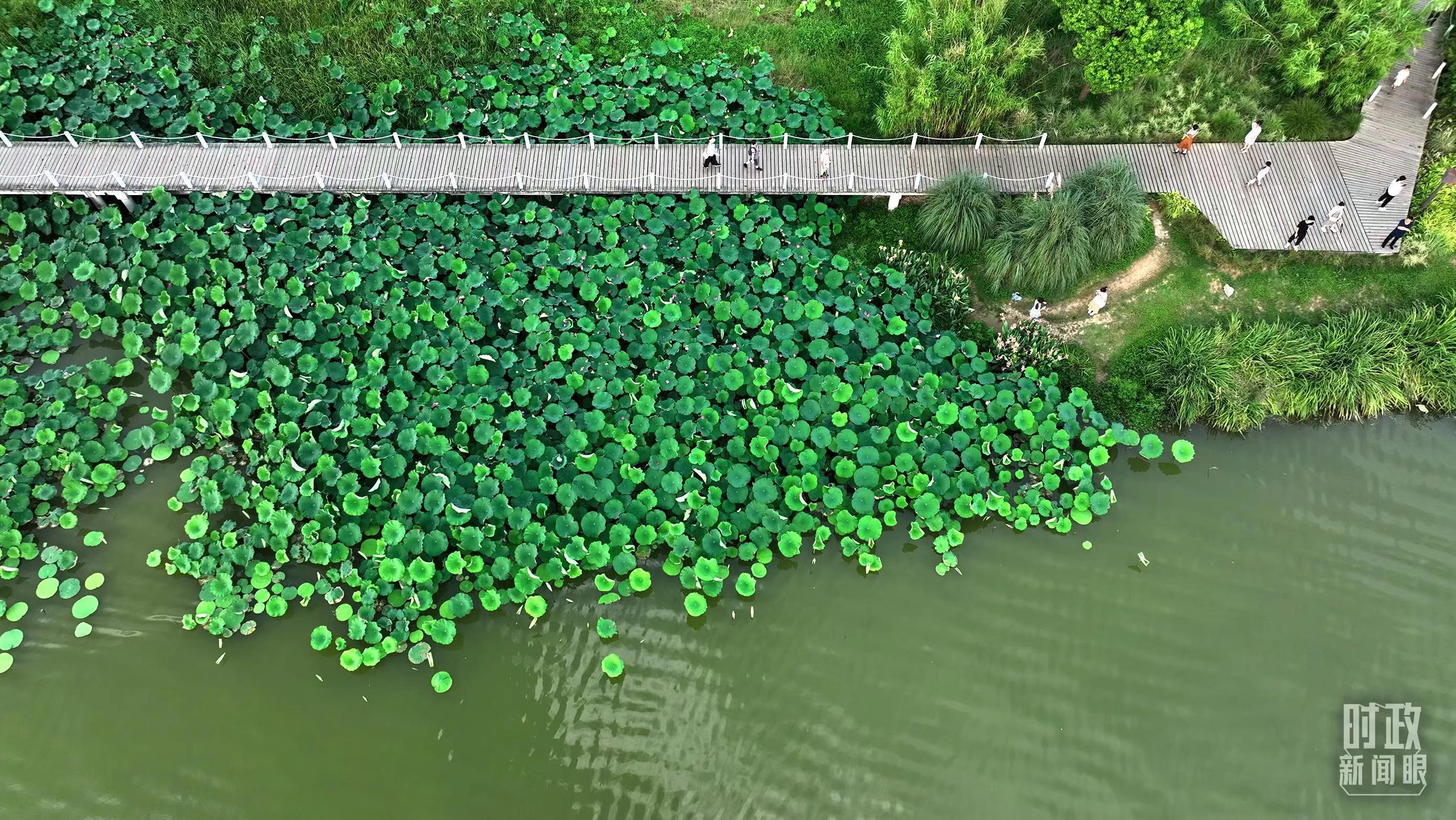 陜西漢中天漢濕地公園內,游人穿行,荷影婆娑。(總臺記者劉海濤拍攝)
