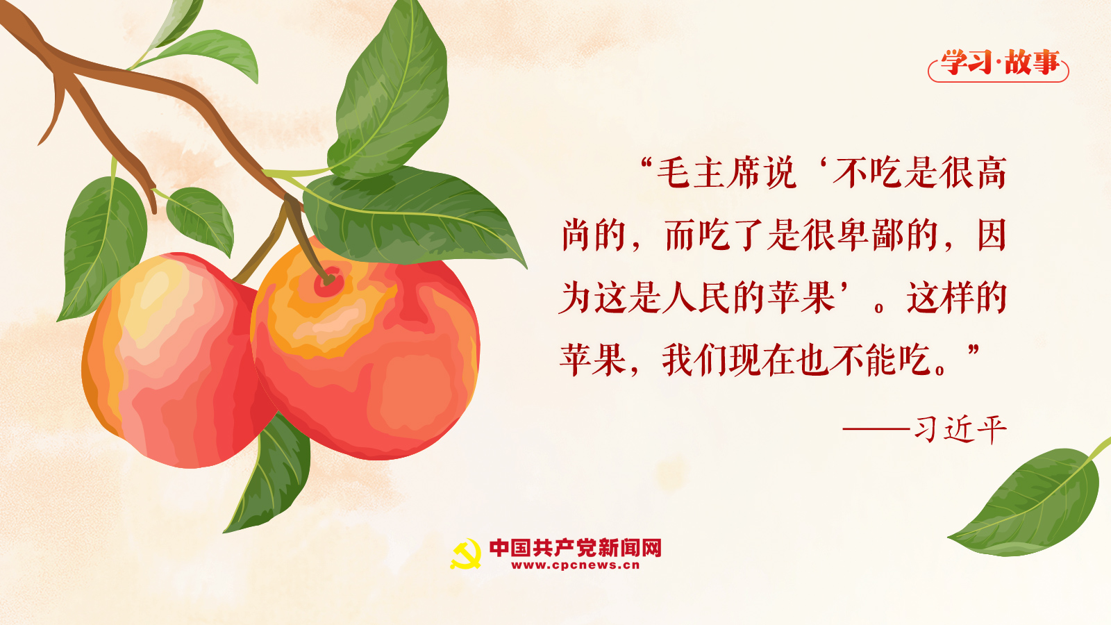 “毛主席說‘不吃是很高尚的,而吃了是很卑鄙的,因?yàn)檫@是人民的蘋果’。這樣的蘋果,我們現(xiàn)在也不能吃。”習(xí)近平總書記意味深長地說。