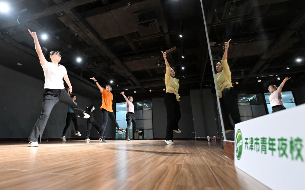 在天津青年宮,學(xué)員在青年夜校練習(xí)有氧健身舞(2024年4月23日攝)。 新華社記者 趙子碩 攝