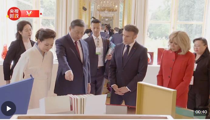 當(dāng)?shù)貢r(shí)間5月6日下午,國(guó)家主席習(xí)近平在巴黎愛麗舍宮同法國(guó)總統(tǒng)馬克龍舉行會(huì)談。會(huì)談前,習(xí)近平向馬克龍贈(zèng)送圖書。