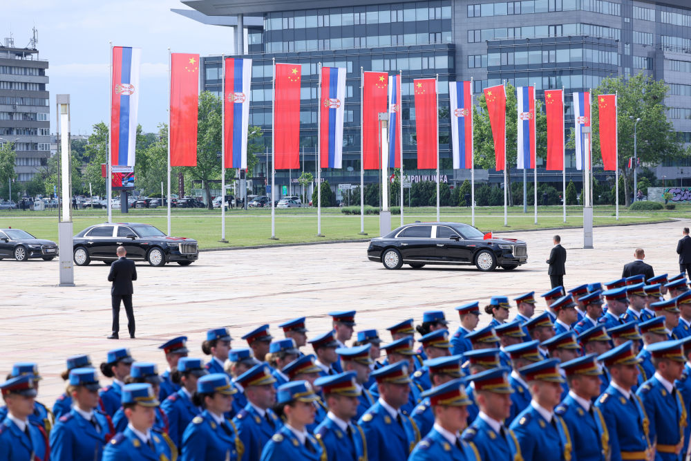 塞爾維亞大廈前,中塞兩國(guó)國(guó)旗迎風(fēng)飄揚(yáng),儀仗隊(duì)威武雄壯。