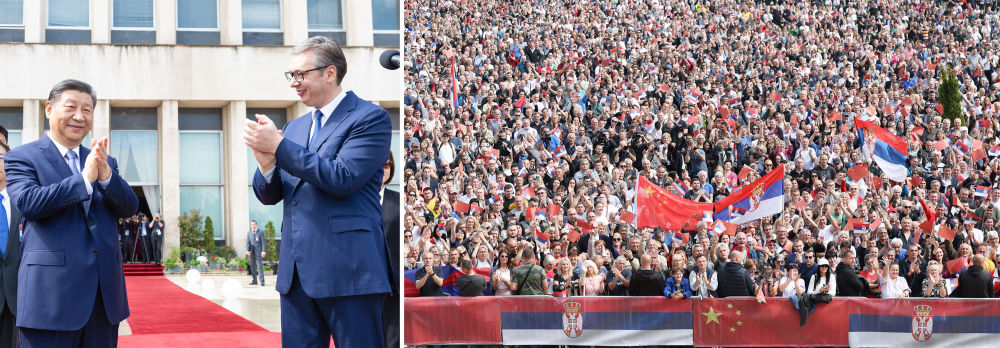 在塞爾維亞,武契奇總統(tǒng)率眾多政要赴機場迎接習(xí)近平主席。近2萬名塞爾維亞民眾齊聚塞爾維亞大廈廣場,揮舞中塞兩國國旗,熱情高呼“中國”的場景,令人感動;