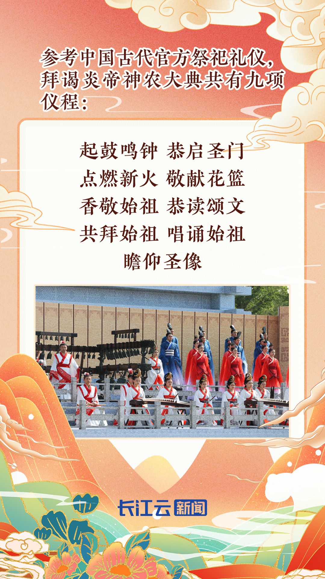在儀式流程方面,設(shè)計(jì)有:起鼓鳴鐘、恭啟圣門、點(diǎn)燃新火、敬獻(xiàn)花籃、香敬始祖、恭讀頌文、共拜始祖、唱誦始祖、瞻仰圣像等九項(xiàng)儀程,充分融入了炎帝文化、荊楚文化、曾隨文化的元素;