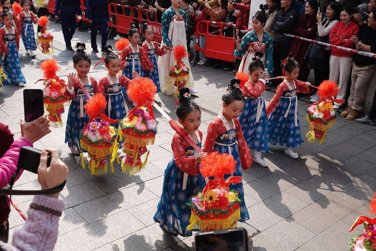 2024年3月4日,“潮州青龍廟會”非遺巡游舉行。圖為幼兒園小朋友身穿漢服在昌黎路巡游。