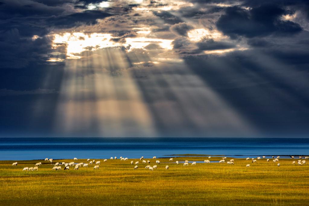 清晨,一道泛著紅暈的光從煙波浩渺的湖面徐徐升起,大湖之畔,氈房點點,牛羊滿坡,野花綻放。