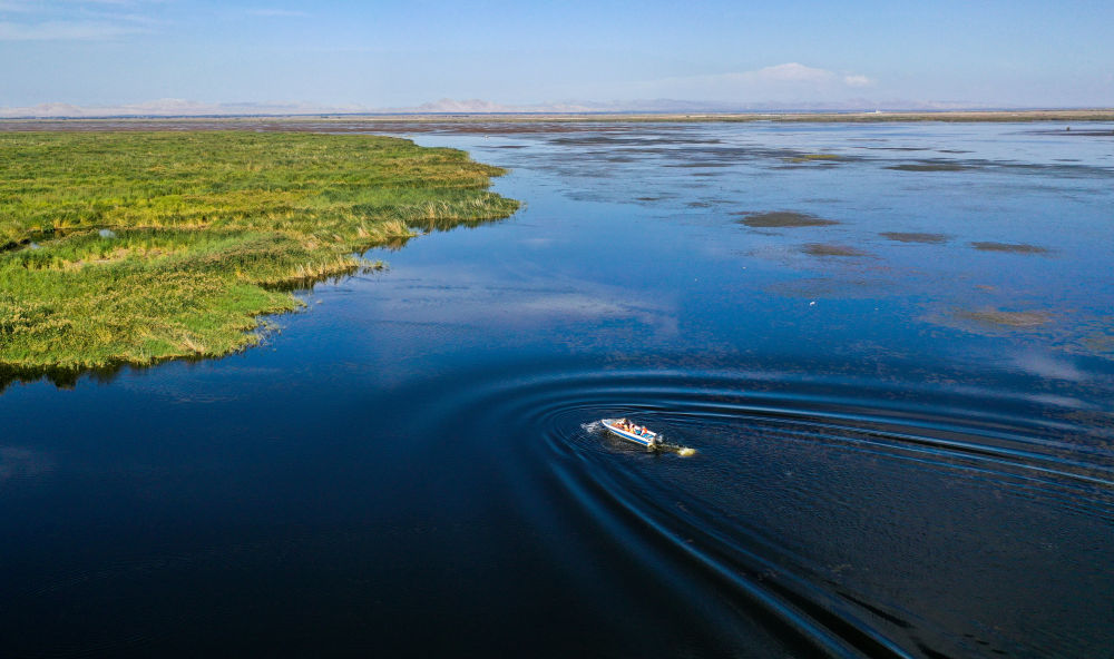 2023年9月15日,河湖濕地水環(huán)境保護與修復(fù)技術(shù)研究團隊在內(nèi)蒙古烏梁素海采集湖水樣本(無人機照片)。位于黃河“幾字彎”頂部的烏梁素海,是黃河流域最大的湖泊濕地,是控制京津風(fēng)沙源的天然生態(tài)屏障。近年來,當(dāng)?shù)夭粩嗉訌姙趿核睾>C合治理力度,生態(tài)環(huán)境持續(xù)好轉(zhuǎn)。