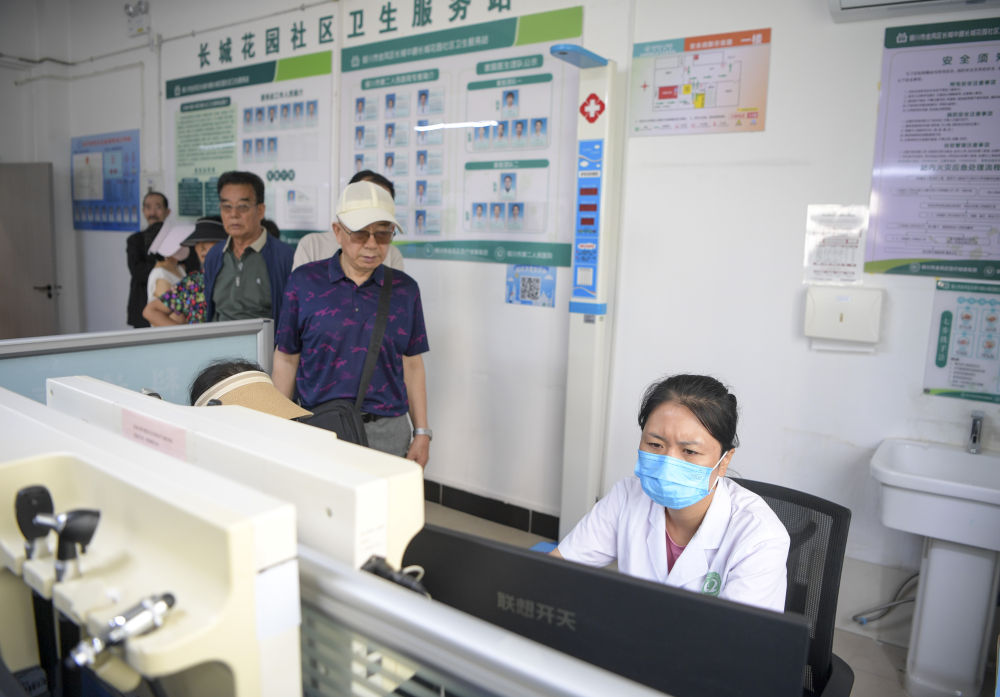 6月20日,長(zhǎng)城花園社區(qū)衛(wèi)生站的工作人員為居民登記醫(yī)療信息。