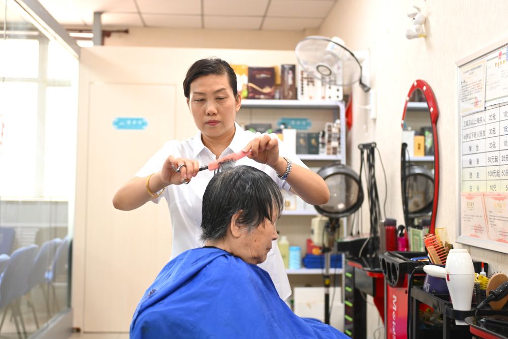 6月20日,長(zhǎng)城花園社區(qū)的志愿者為居民理發(fā)。