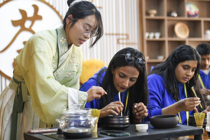 2024年4月15日,參加2024年“漢語橋”上合組織國家青年學生春令營的來華青年學生在新疆師范大學學生(左)的指導下學習茶藝。