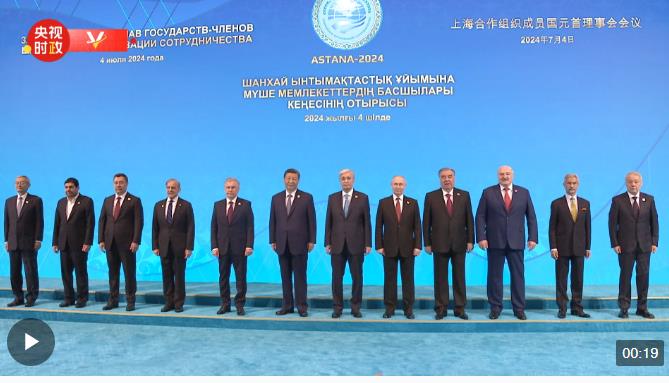 當地時間7月4日上午,國家主席習近平在阿斯塔納獨立宮出席上海合作組織成員國元首理事會第二十四次會議。習近平同上海合作組織成員國領導人集體合影。