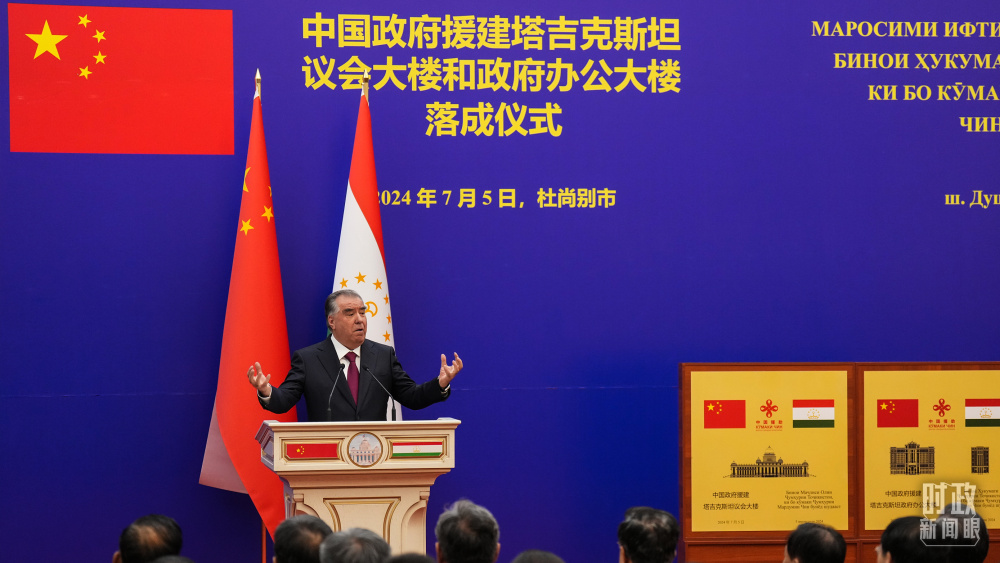 5日,拉赫蒙總統(tǒng)陪同習(xí)主席共同步入議會大樓。兩國元首參觀中方援塔議會大樓和政府大樓項目展板,共同為兩座大樓揭牌。