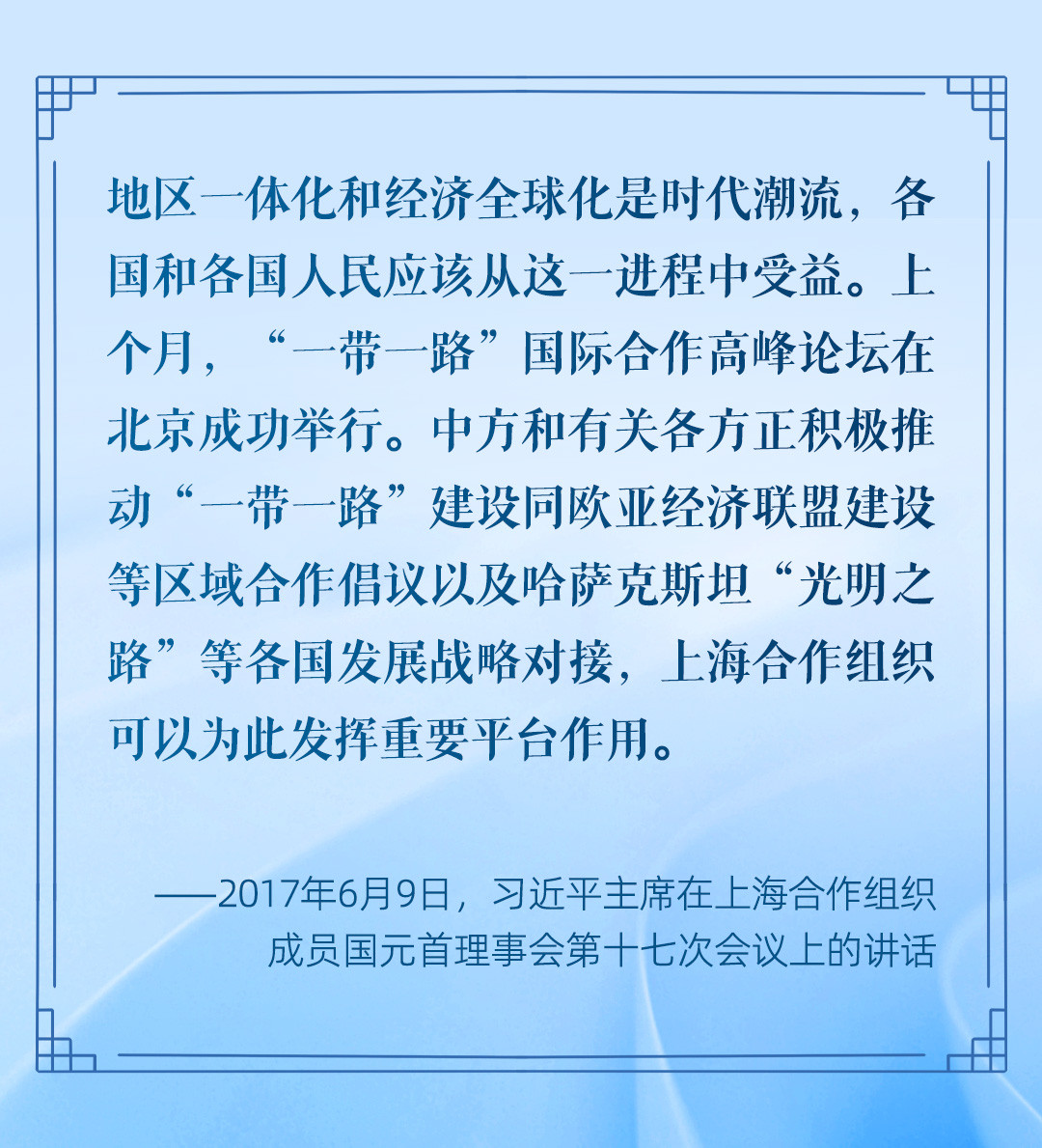 在上海合作組織這個(gè)世界上人口最多、幅員最遼闊的大家庭,好鄰居心連心、好朋友肩并肩、好伙伴手牽手,不斷拓展互利合作、共同發(fā)展的廣闊空間,朝著實(shí)現(xiàn)現(xiàn)代化的宏偉藍(lán)圖,在可持續(xù)發(fā)展之路上不斷邁進(jìn)。