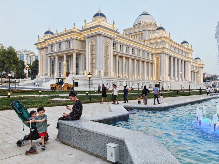 2024年6月29日,在塔吉克斯坦首都杜尚別,人們?cè)谒怂固棺h會(huì)大樓前休閑。新華社記者 申宏 攝