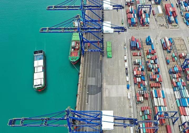 集裝箱貨輪在海南洋浦國際集裝箱碼頭裝卸貨物。