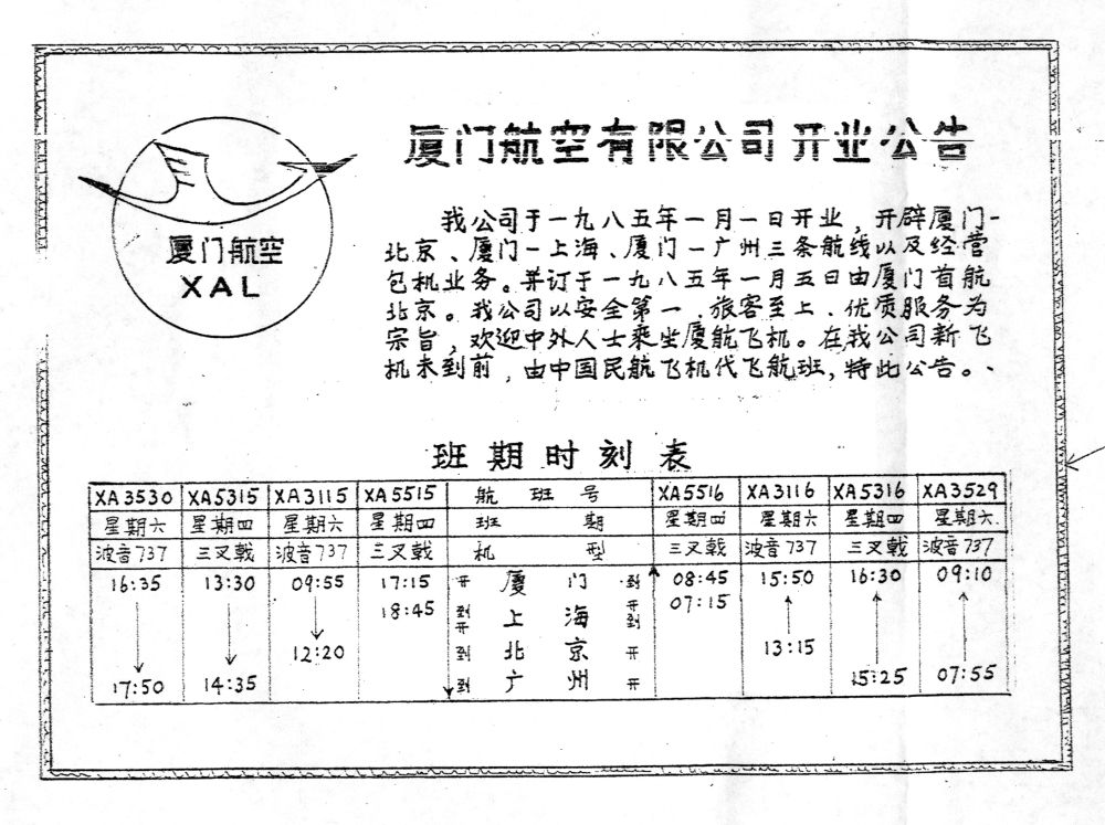 廈門航空一屆一次董事會在中國民用航空局辦公大樓召開,標志著廈航正式成立。這是當時職工自制的公司牌匾,選取了廈門最具代表性的鳥類