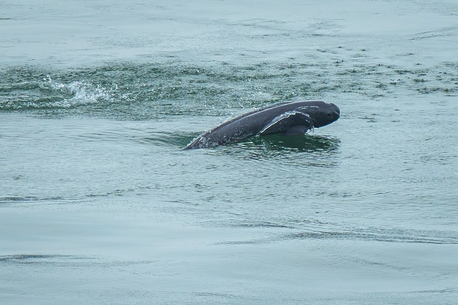 長江江豚在湖北省宜昌市葛洲壩下游水域逐浪嬉戲(2024年5月21日攝)。新華社記者 肖藝九 攝