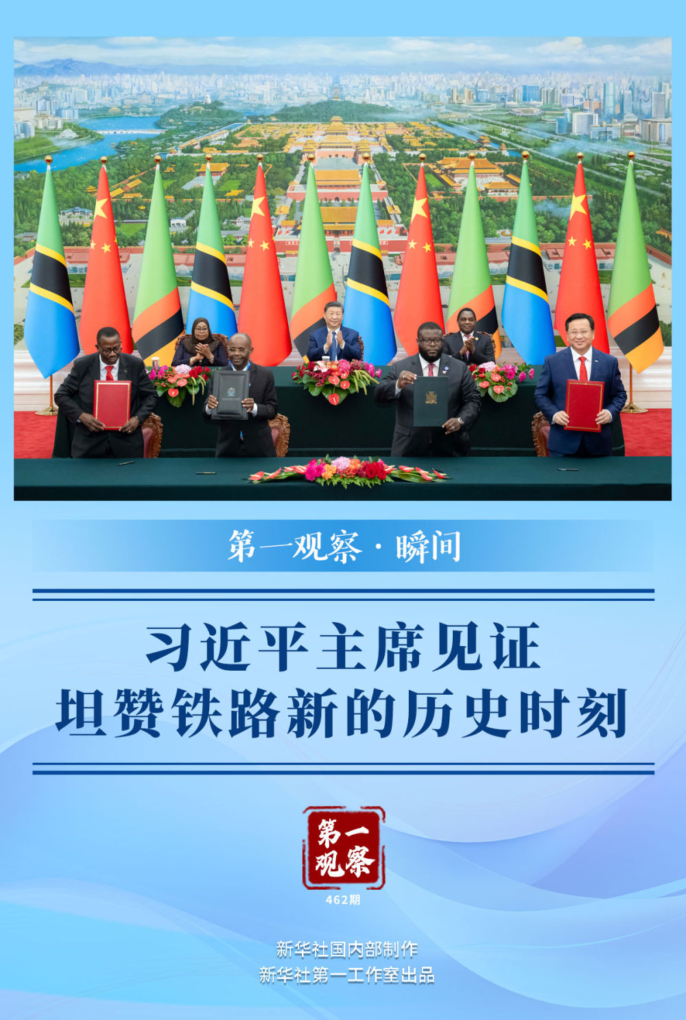 新華社記者用鏡頭記錄下又一歷史時刻——習(xí)近平主席同來華出席中非合作論壇北京峰會的坦桑尼亞總統(tǒng)哈桑、贊比亞總統(tǒng)希奇萊馬,在這里共同見證簽署《坦贊鐵路激活項目諒解備忘錄》。簽署完畢,現(xiàn)場熱烈的掌聲經(jīng)久不息。