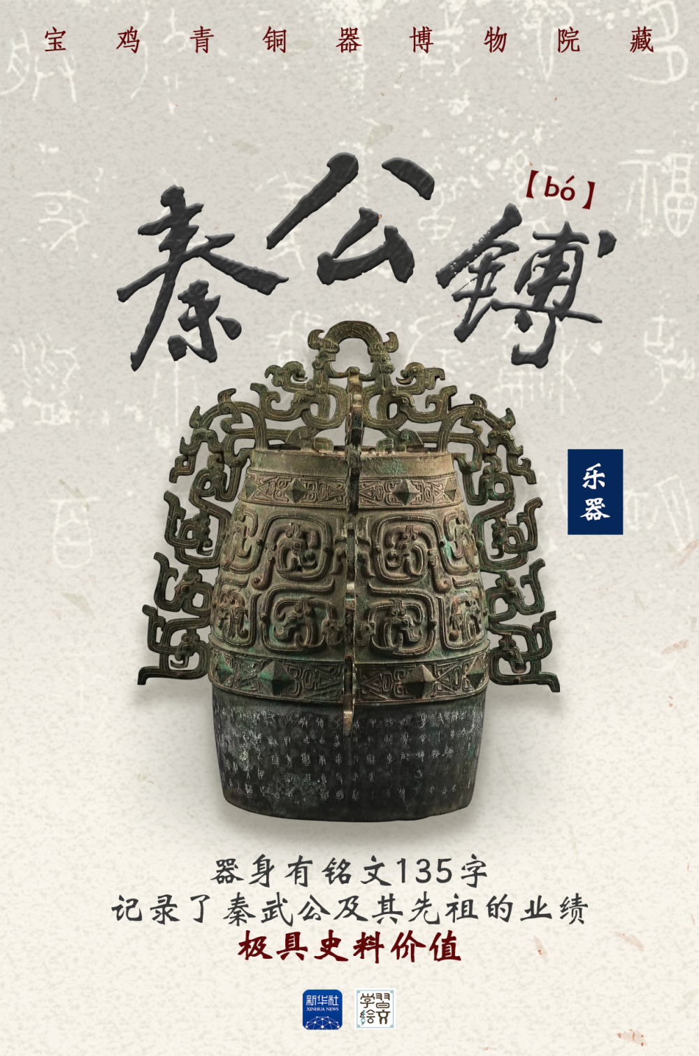 這件秦公镈是大型打擊樂器,器身有135字銘文,記述了秦襄公被周平王“賞宅受國”的歷史,以及文公、靜公、憲公三代治國興邦的業(yè)績,是研究秦國早期歷史的重要實物資料。