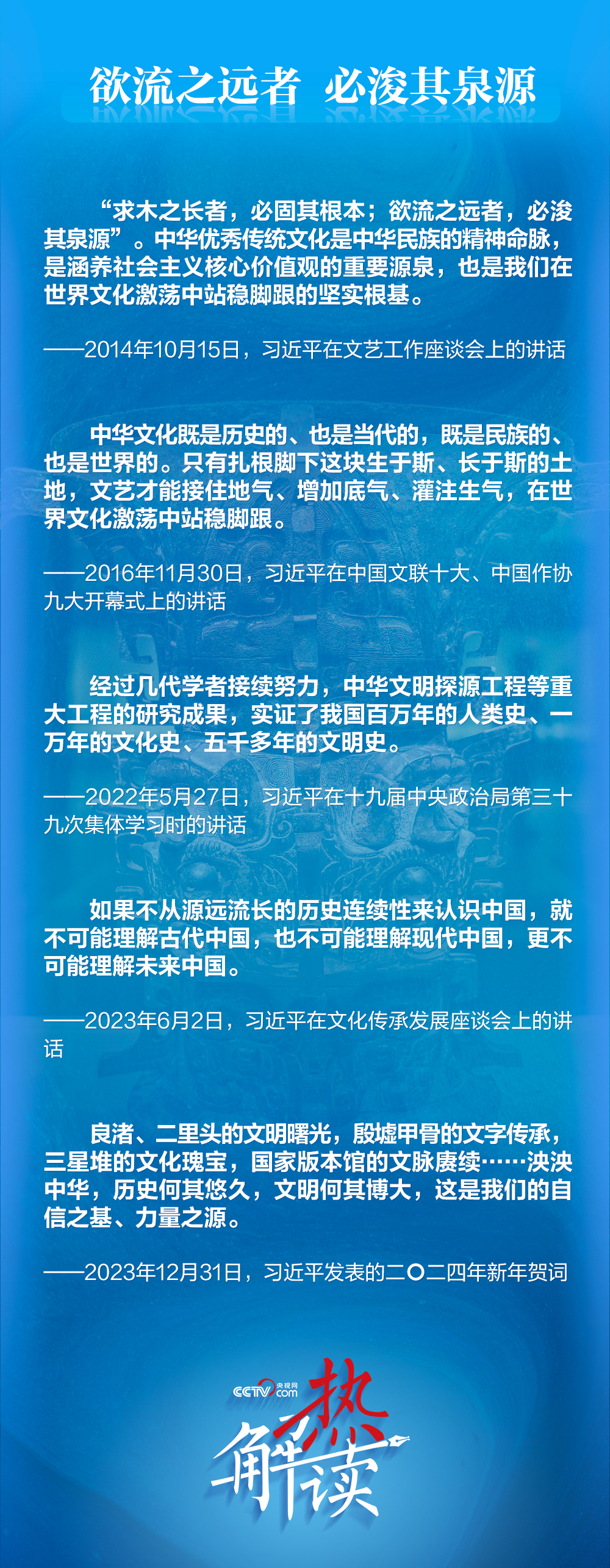 一件件文物、一處處文化古跡、一項(xiàng)項(xiàng)文化藝術(shù),串連起中華民族的文化史,蘊(yùn)藏著“何以中國”的文化力量??倳泴?duì)中華文明之源的關(guān)注,彰顯的正是他對(duì)推動(dòng)文化繁榮、建設(shè)文化強(qiáng)國的深刻思考和文化自信。