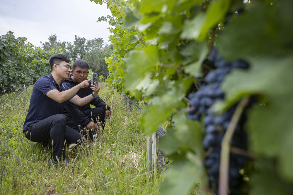 2024年8月15日,技術人員(左)和工作人員在寧夏銀川市西夏區(qū)的一個葡萄園工作。為推動黃河流域生態(tài)保護和高質量發(fā)展先行區(qū)建設,銀川市積極打造高標準葡萄園,借助各種傳感器監(jiān)測釀酒葡萄的生長狀態(tài),實現(xiàn)精準灌溉,從而高效節(jié)約黃河水。