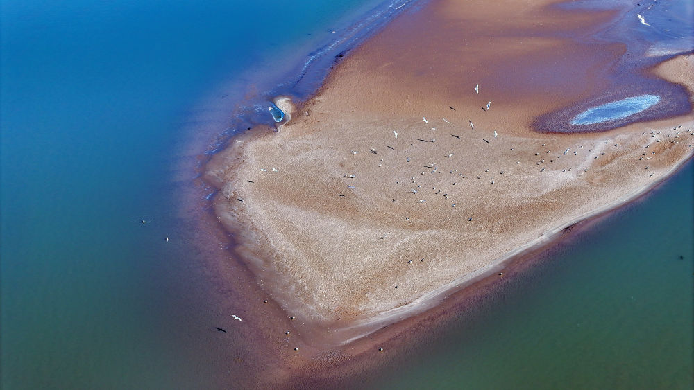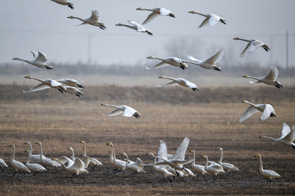 2024年3月16日在內蒙古呼和浩特市托克托縣黃河濕地拍攝的天鵝。隨著當?shù)厣鷳B(tài)環(huán)境持續(xù)改善,候鳥數(shù)量連年增加。