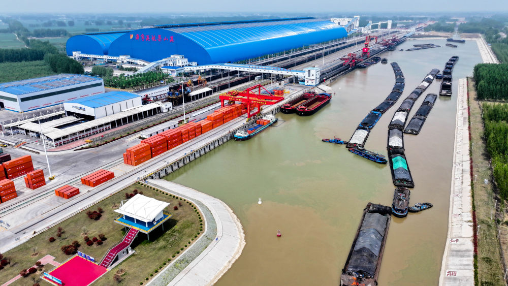 2024年4月24日,船舶行駛在山東濟寧港航梁山港航道上(無人機照片)。近年來,山東省加快構建沿黃陸海大通道,有效促進黃河流域各省區(qū)物流降本增效,實現(xiàn)更高水平對外開放。
