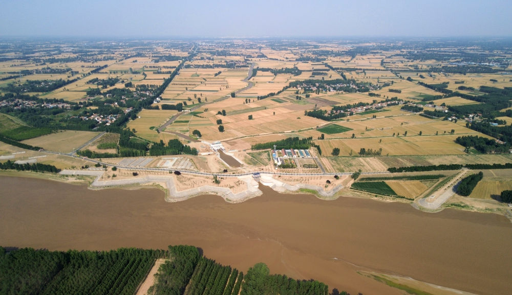 2024年6月19日,位于黃河高青段的馬扎子引黃閘開閘引水(無人機照片)。5月1日至6月18日,山東省累計啟用引黃閘63座,引黃河水量10.06億立方米,保障農業(yè)灌溉需求。