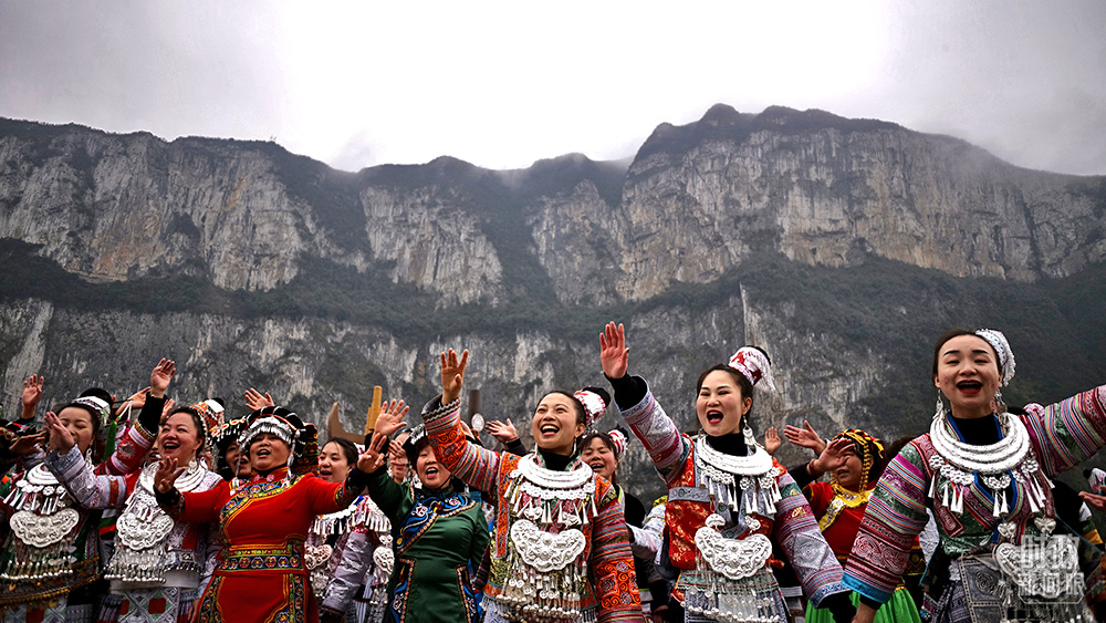2021年2月,習(xí)近平總書(shū)記來(lái)到貴州化屋村考察,當(dāng)?shù)卮迕裼脷g快的苗家歌舞迎接總書(shū)記。(總臺(tái)央視記者王哈男拍攝)