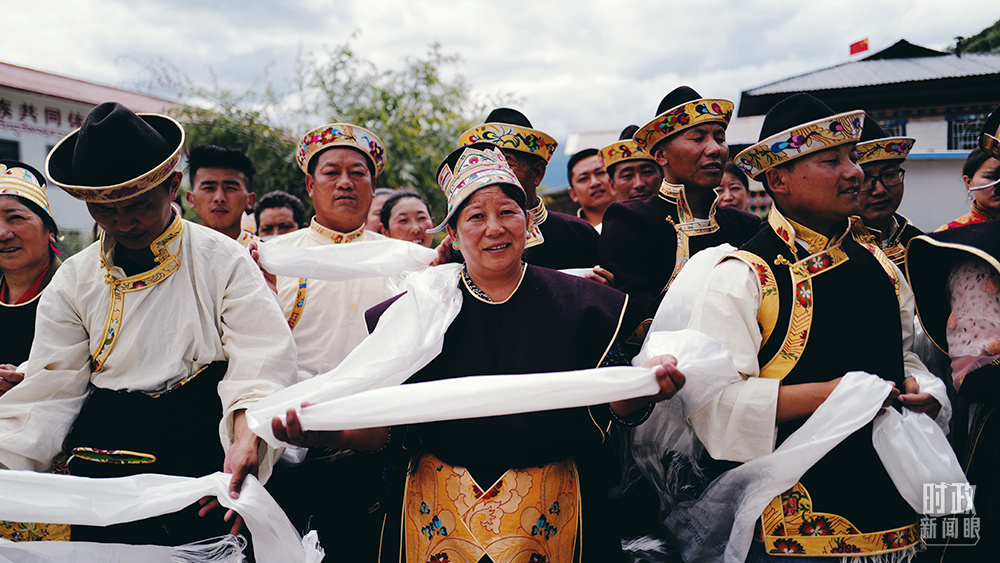 2021年7月,習(xí)近平總書(shū)記來(lái)到西藏林芝市嘎拉村考察。村民們手捧哈達(dá),熱情迎接。(總臺(tái)央視記者彭漢明拍攝)