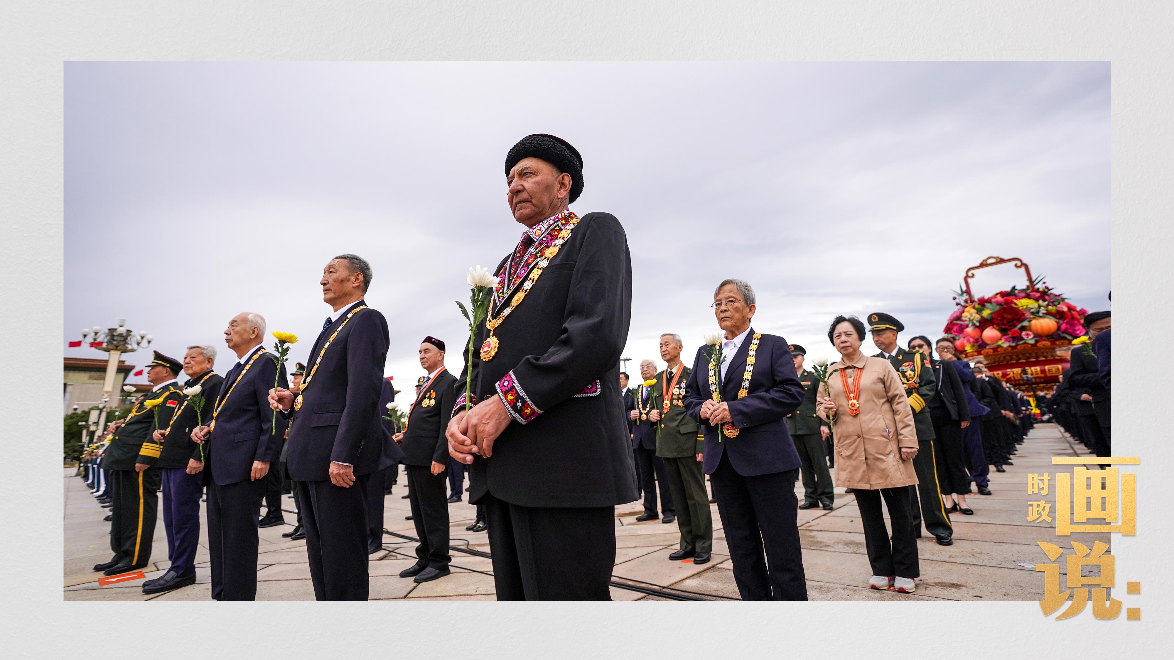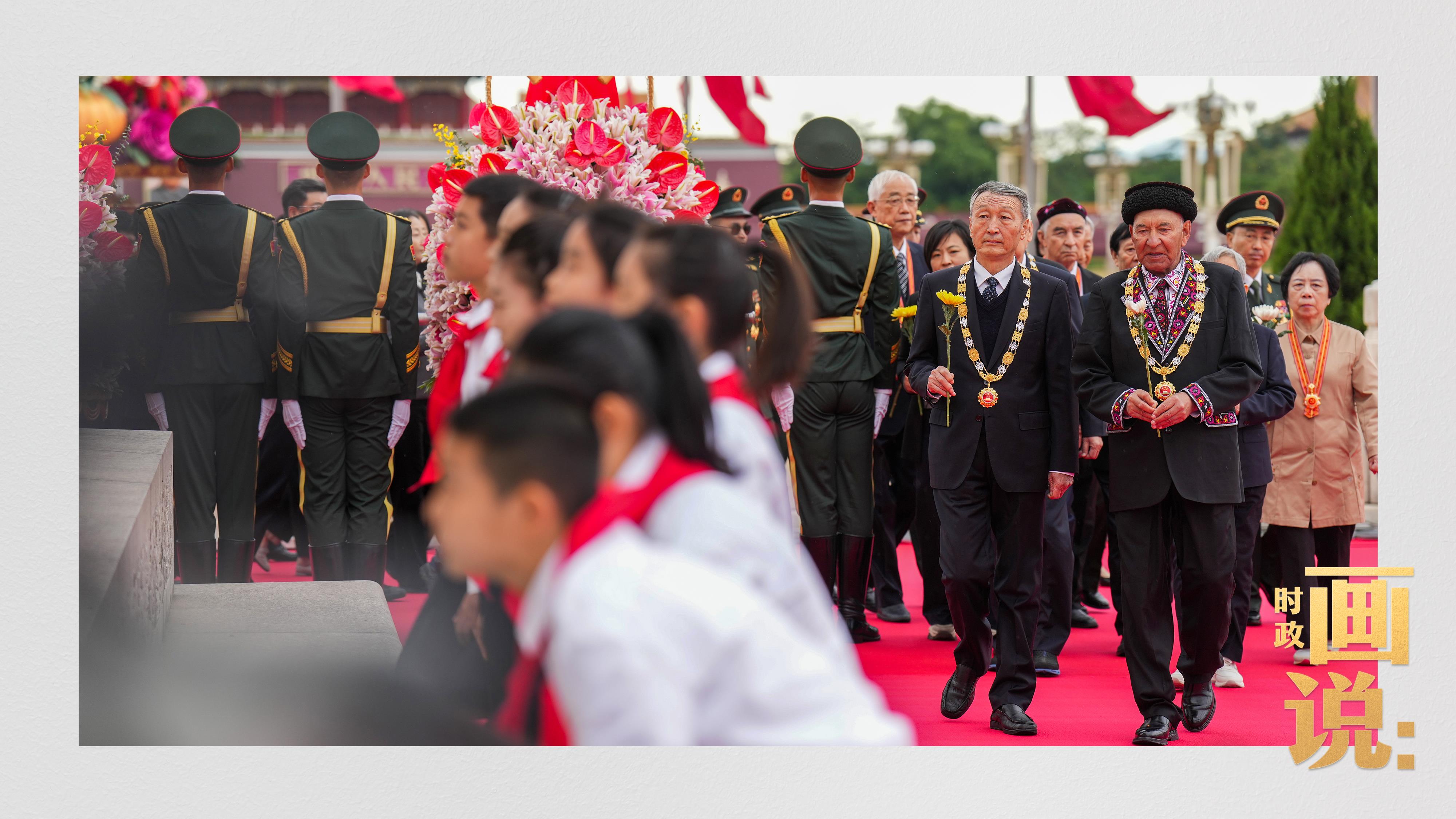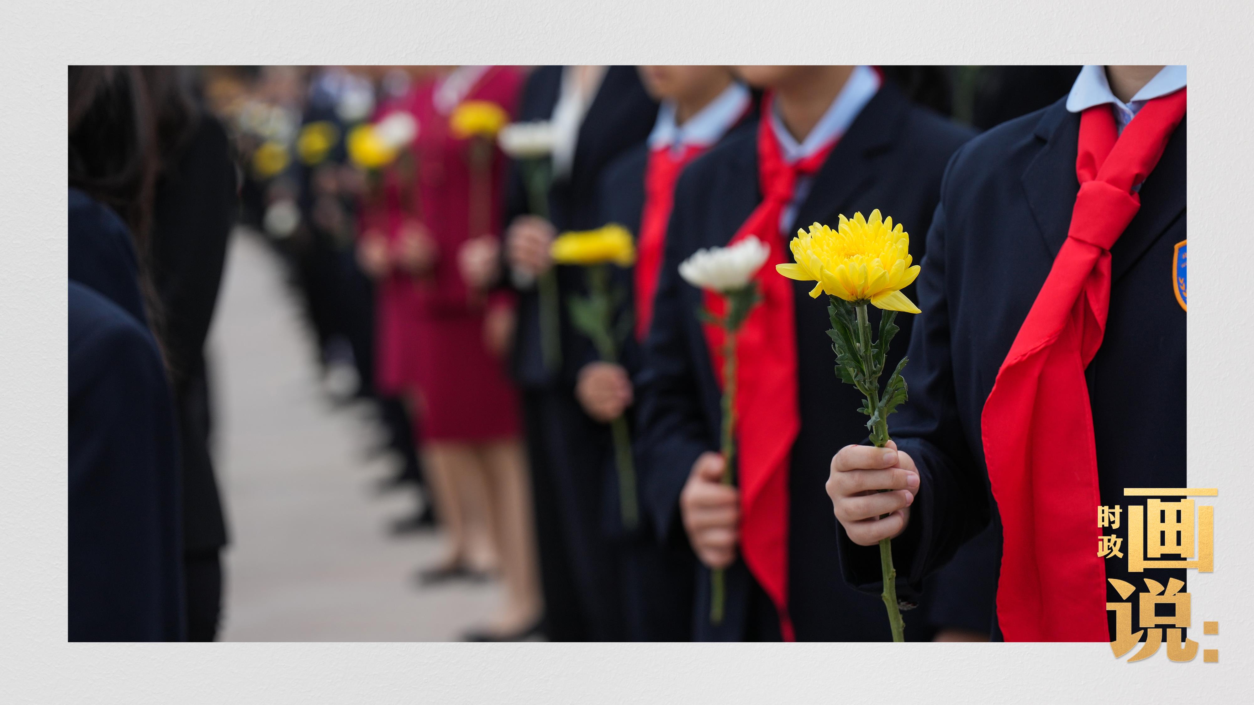 少年兒童和各界代表依次走到紀(jì)念碑前,獻上手中鮮花并瞻仰紀(jì)念碑。