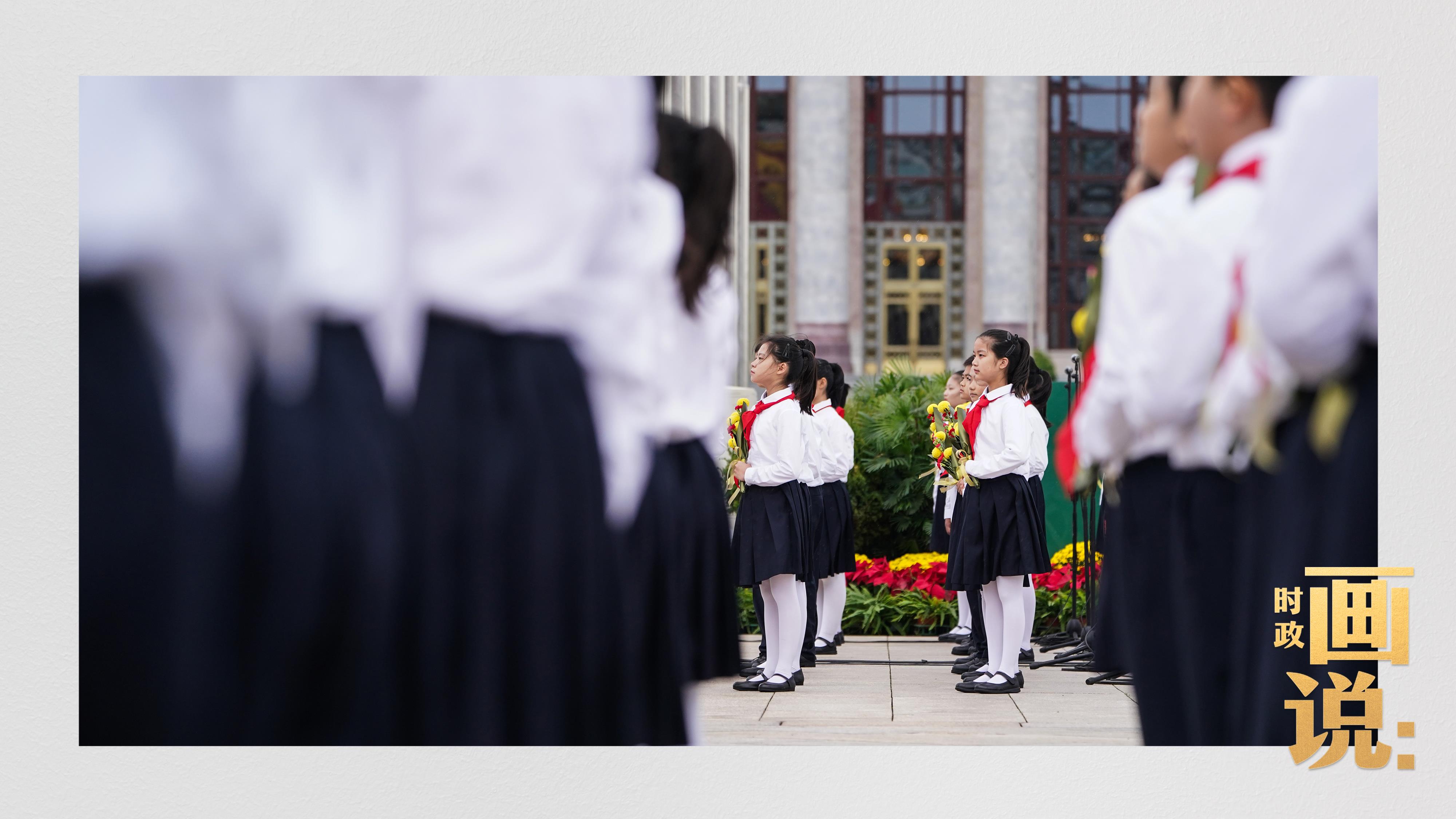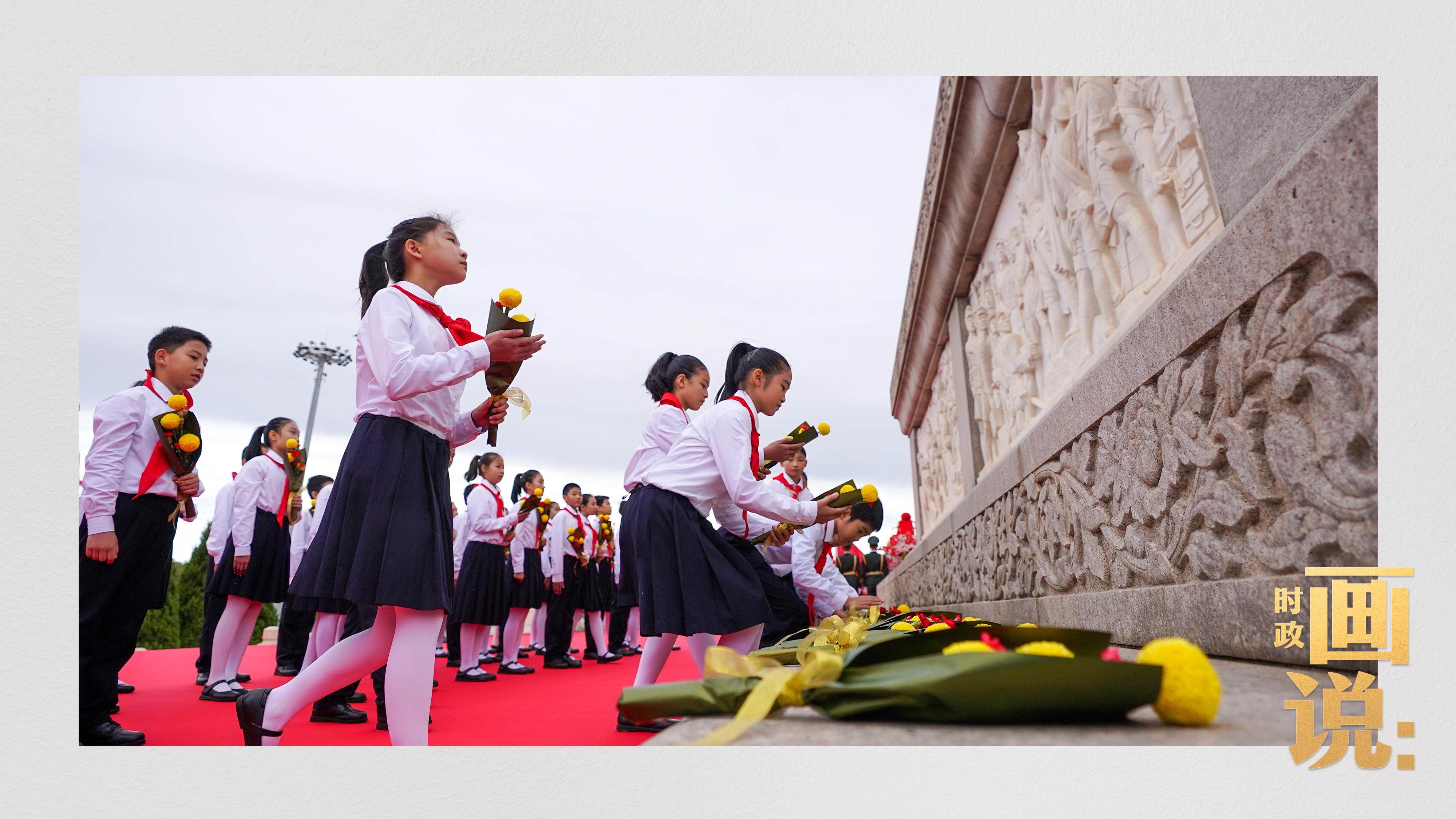 手持鮮花的少年兒童面向人民英雄紀(jì)念碑高唱《我們是共產(chǎn)主義接班人》。