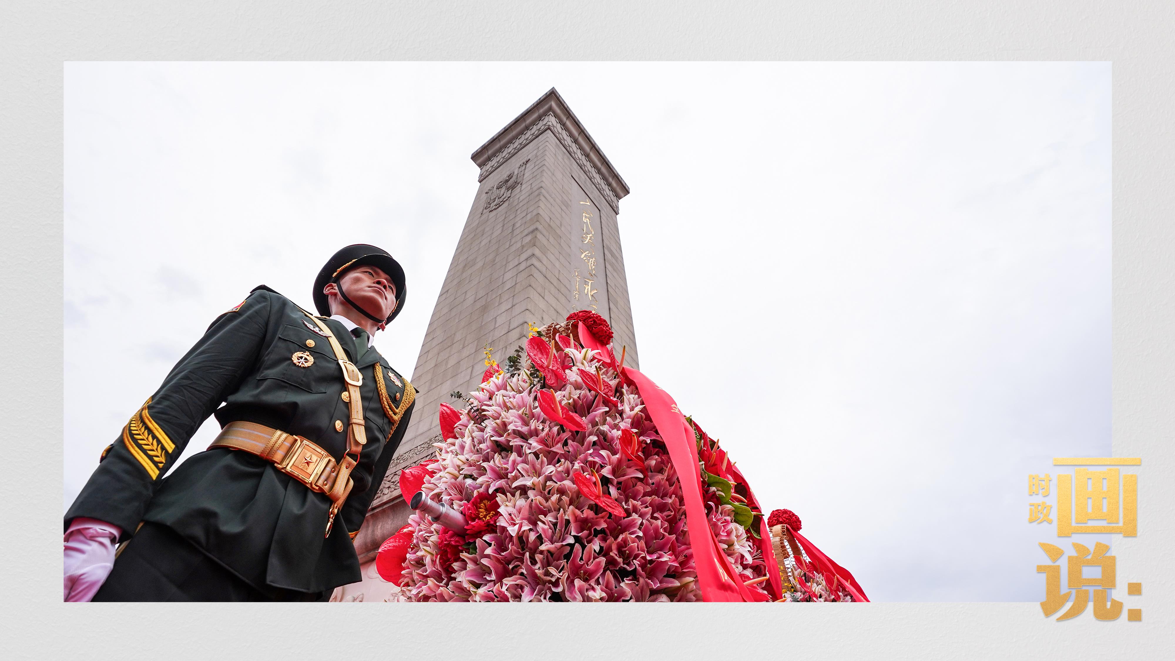 禮兵抬起花籃,緩步走向人民英雄紀(jì)念碑。