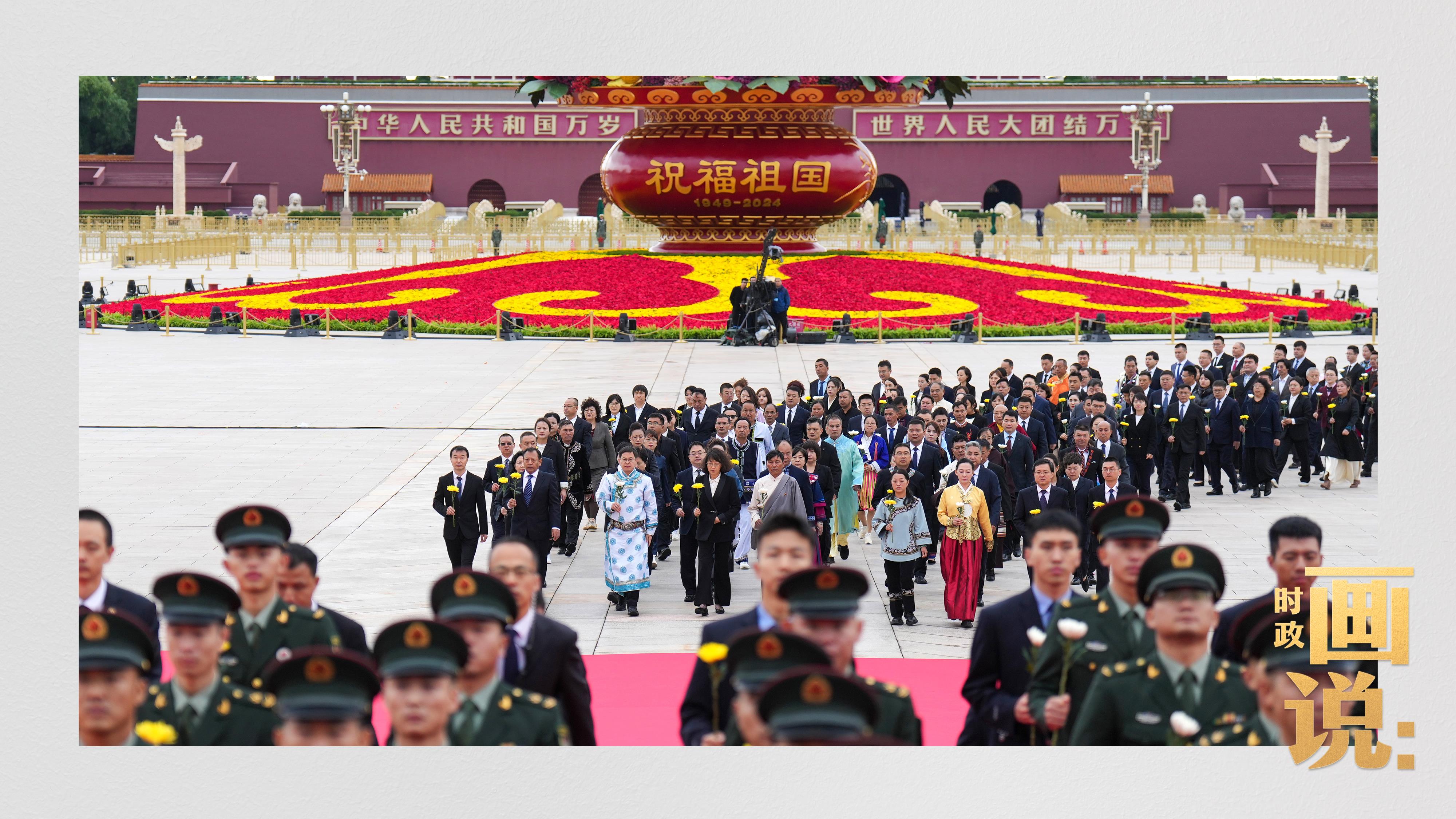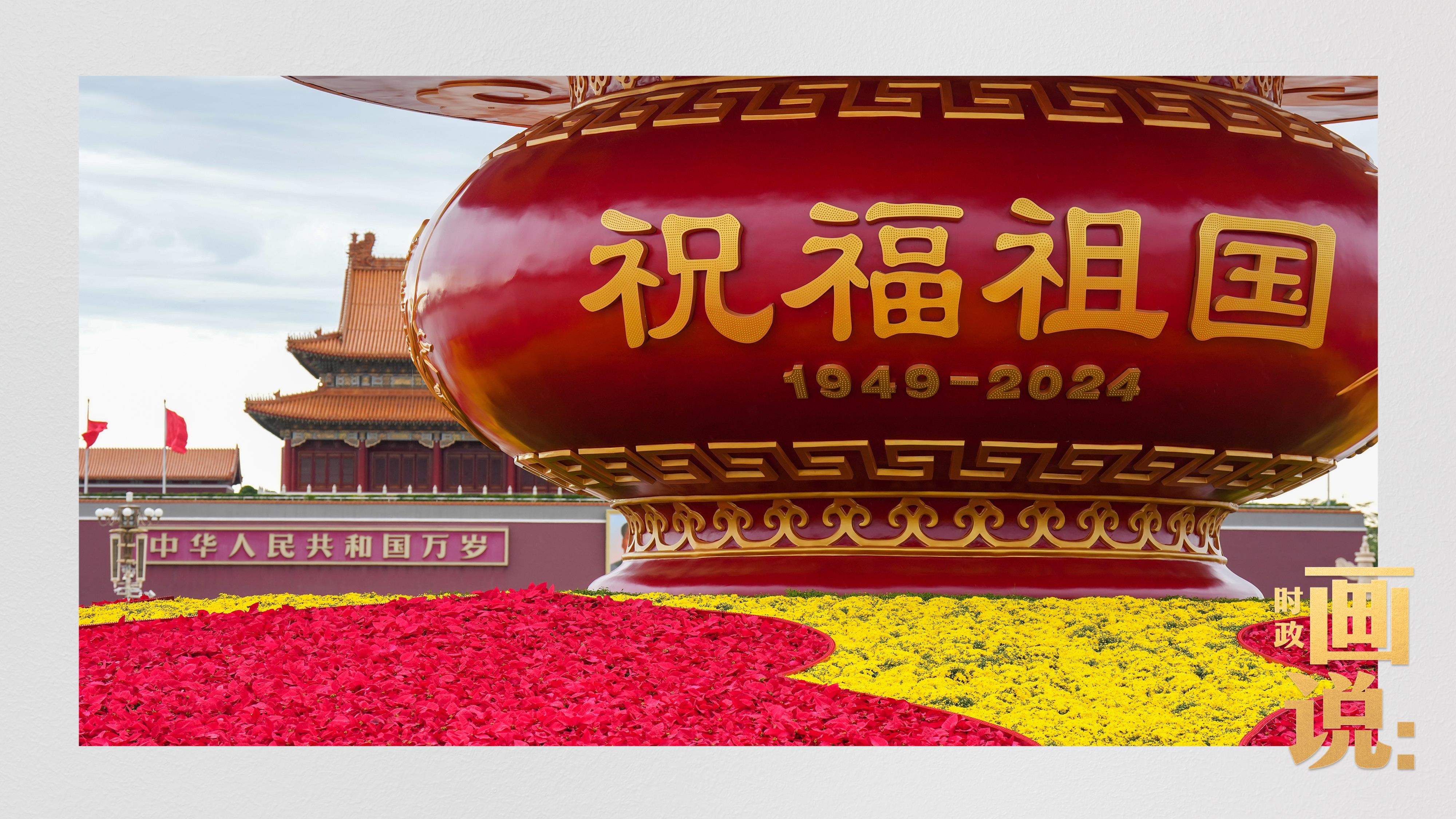 天安門廣場中央,“祝福祖國”巨型花籃表達(dá)著對國家繁榮富強的美好祝福。