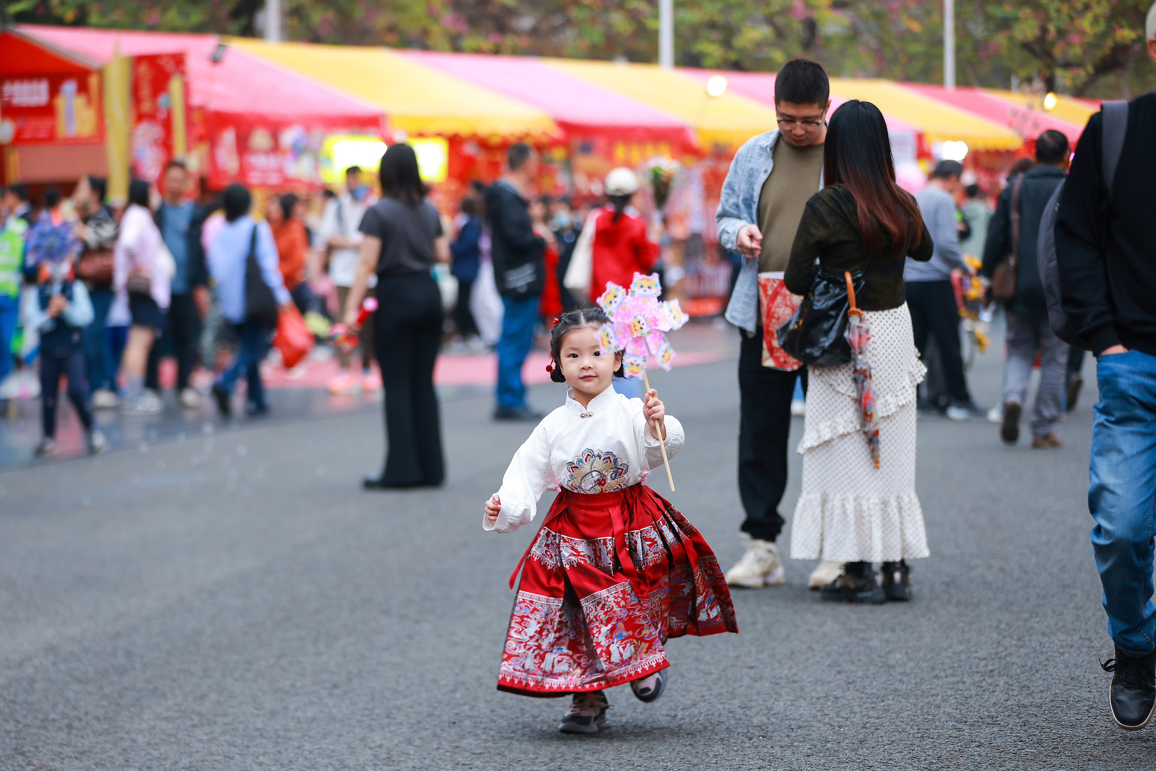 拿著風(fēng)車穿著馬面裙的小女孩在廣州的花市上開心奔跑。
