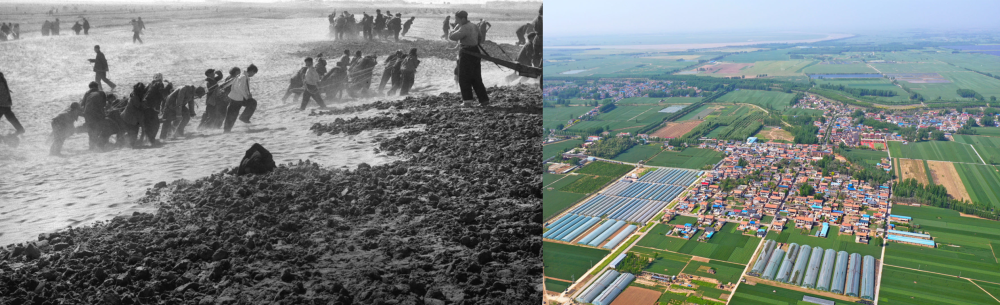 拼版照片:左圖為蘭考群眾在拉淤土壓沙(新華社記者 鄧歷耕 攝);右圖為2024年4月25日拍攝的蘭考縣張莊村(無人機照片,新華社記者 郝源 攝)。