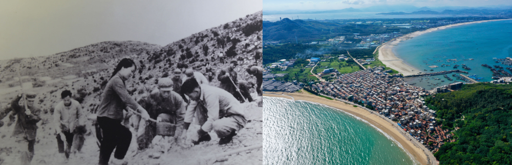 拼版照片:左圖為東山縣群眾在荒山上種植樹苗(資料照片);右圖為2020年6月18日拍攝的東山縣陳城鎮(zhèn)澳角村附近風光(無人機照片,新華社記者 姜克紅 攝)。