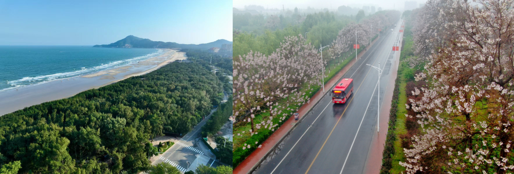 拼版照片:左圖為位于東山縣金鑾灣沿岸的木麻黃防護林帶(無人機照片,新華社記者 姜克紅 攝);右圖為2021年4月20日在蘭考縣焦裕祿干部學院附近拍攝的泡桐花(無人機照片,新華社記者 郝源 攝)。