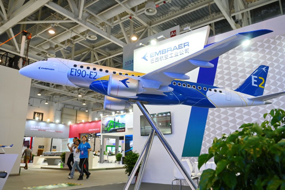 這是在廈門舉行的2024金磚國家新工業(yè)革命展巴西展位展出的E190-E2飛機(jī)模型。新華社記者林善傳攝
