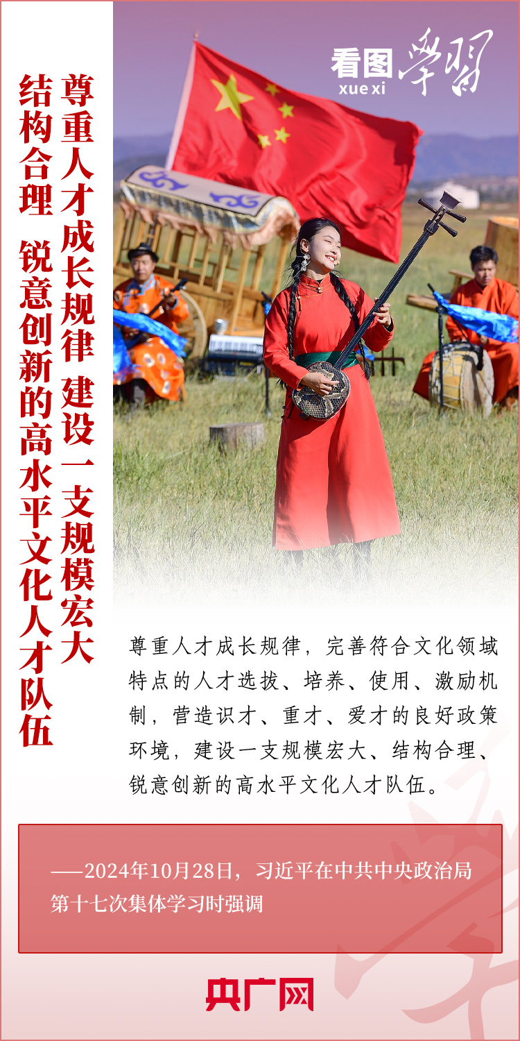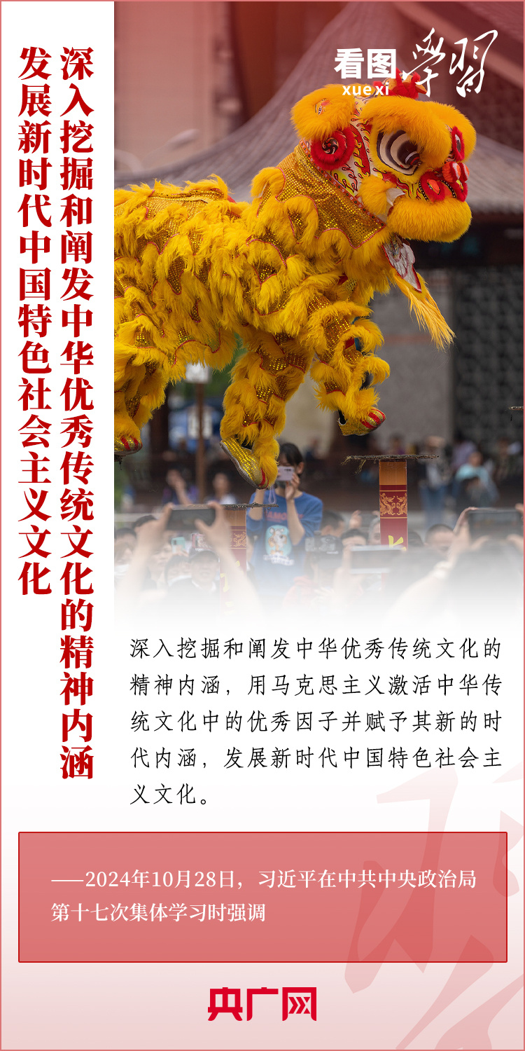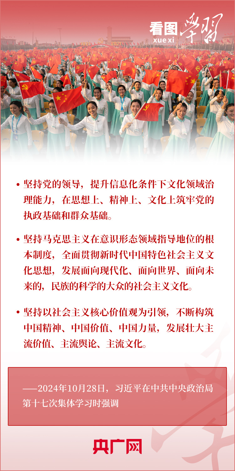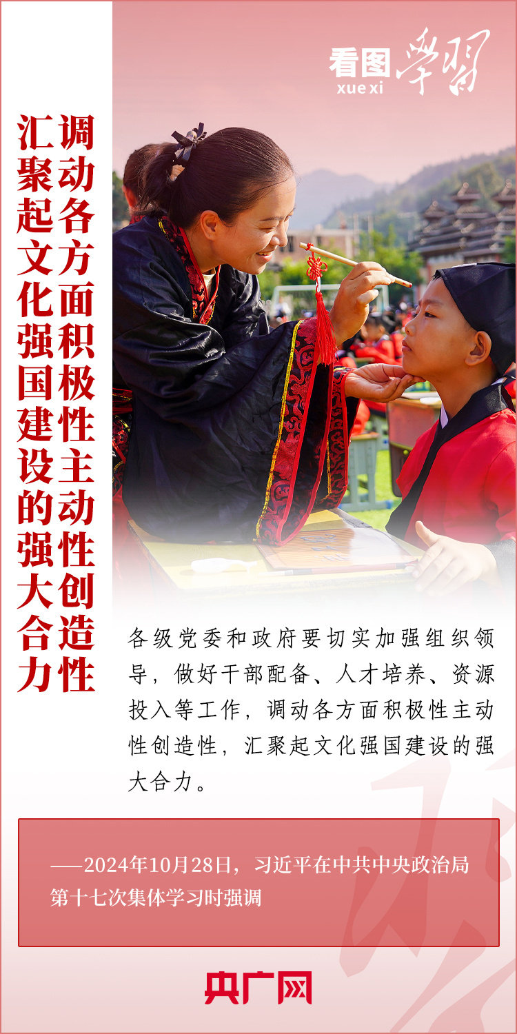 建設(shè)文化強(qiáng)國(guó)是全黨全社會(huì)的共同任務(wù)。10月28日,中共中央政治局就建設(shè)文化強(qiáng)國(guó)進(jìn)行第十七次集體學(xué)習(xí)。習(xí)近平總書記在聽取講解和討論后發(fā)表重要講話,就錨定2035年建成文化強(qiáng)國(guó)戰(zhàn)略目標(biāo)作出最新部署,強(qiáng)調(diào)要“不斷發(fā)展具有強(qiáng)大思想引領(lǐng)力、精神凝聚力、價(jià)值感召力、國(guó)際影響力的新時(shí)代中國(guó)特色社會(huì)主義文化,不斷增強(qiáng)人民精神力量,筑牢強(qiáng)國(guó)建設(shè)、民族復(fù)興的文化根基?!币黄饋?lái)學(xué)習(xí)!