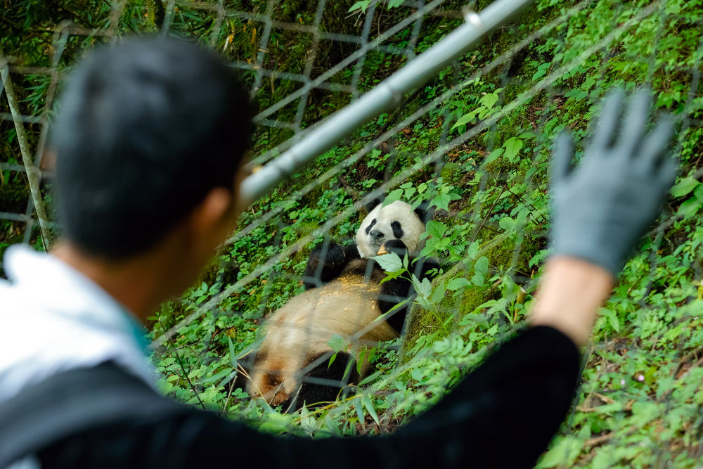 2024年6月24日,在位于大熊貓國(guó)家公園臥龍片區(qū)內(nèi)天臺(tái)山的大熊貓第二階段野化培訓(xùn)場(chǎng)外,工作人員給母熊貓“賢賢”投喂完食物后揮手向其告別。近年來(lái),我國(guó)通過大力實(shí)施天然林保護(hù)、野生動(dòng)植物保護(hù)和大熊貓國(guó)家公園建設(shè)等,保護(hù)大熊貓及其棲息地,成效顯著。大熊貓野外種群總量已從20世紀(jì)80年代的約1100只增長(zhǎng)到近1900只。