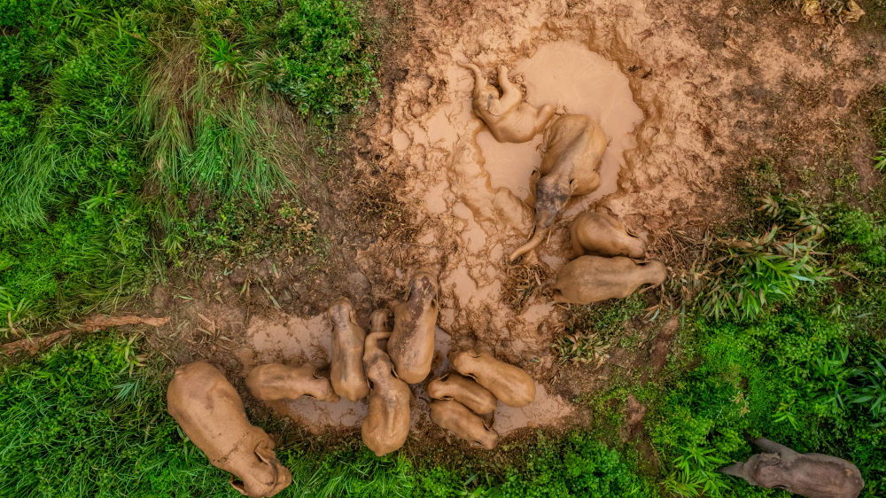 2024年8月8日,“短鼻家族”和“然然家族”的野象在云南省西雙版納州景洪市大渡崗鄉(xiāng)的泥塘里玩耍(無(wú)人機(jī)照片)。近年來(lái),云南修復(fù)改造了一些大象棲息地,種植大象愛吃的植物,同時(shí)運(yùn)用紅外相機(jī)等技術(shù)手段,實(shí)現(xiàn)亞洲象位置信息的實(shí)時(shí)發(fā)布。