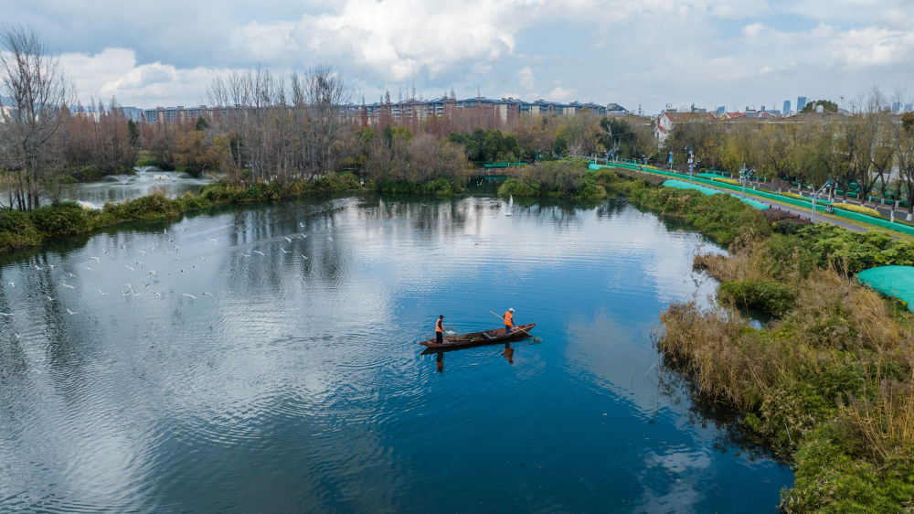 2024年1月16日,管護(hù)人員在滇池打撈雜物(無(wú)人機(jī)照片)。據(jù)昆明市滇池管理局介紹,2023年滇池全湖水質(zhì)持續(xù)向好,自2018年上升為Ⅳ類水質(zhì)后,連續(xù)六年保持全湖水質(zhì)Ⅳ類。