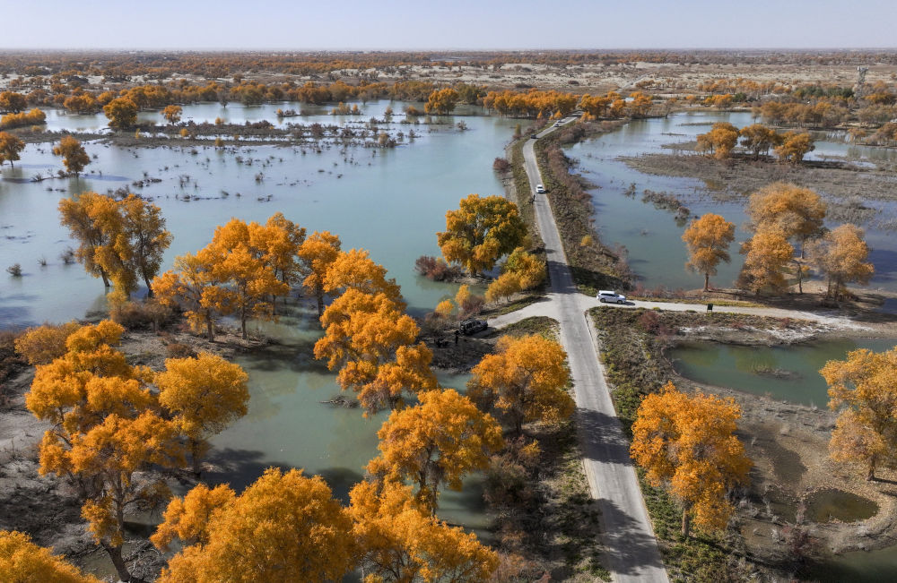 2023年11月4日拍攝的新疆尉犁縣羅布淖爾國(guó)家濕地公園(無(wú)人機(jī)照片)。新疆沿塔里木河流域分布著約1500萬(wàn)畝胡楊林,是世界面積最大的胡楊林區(qū)。