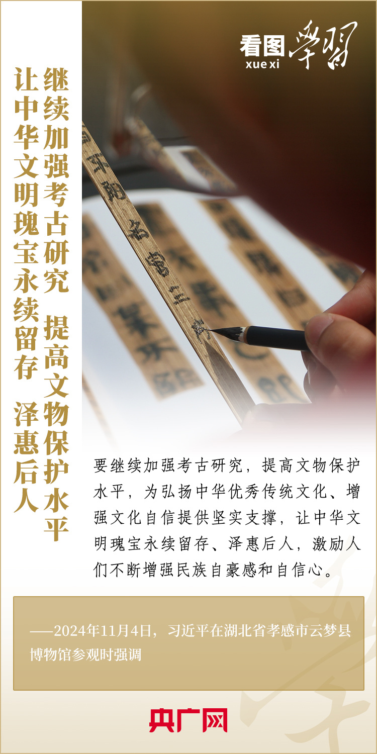11月4日,習(xí)近平總書記在湖北省孝感市云夢縣博物館參觀出土秦漢簡牘展。這里收藏的我國考古史上首次發(fā)現(xiàn)的秦簡——云夢睡虎地秦簡,反映了戰(zhàn)國晚期到秦始皇時(shí)期的政治、經(jīng)濟(jì)、文化、法律、軍事等方面的情況。習(xí)總書記詳細(xì)聽取簡牘內(nèi)容、歷史文化價(jià)值和保護(hù)研究情況介紹,指出要繼續(xù)加強(qiáng)考古研究,提高文物保護(hù)水平,讓中華文明瑰寶永續(xù)留存、澤惠后人。