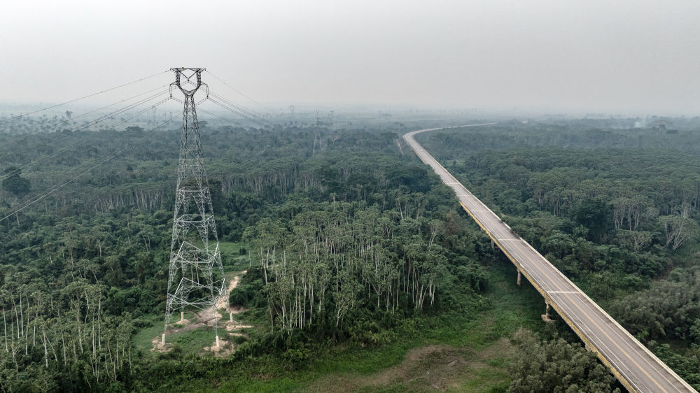 這張9月13日拍攝的照片顯示,在巴西朗多尼亞州,EDP輸變電項目線路穿越熱帶雨林(無人機照片)。巴西EDP輸變電項目是位于巴西北部的阿克里州和朗多尼亞州的綠地輸變電工程,山東電建一公司承擔了該項目的EPC總承包任務(wù)。新華社記者王天聰攝